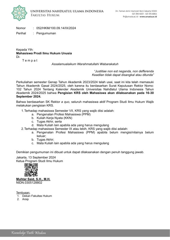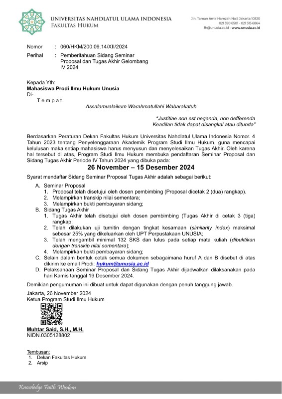 Diberitahukan kepada seluruh mahasiswa Program Studi Ilmu Hukum, bahwa pendaftaran Sidang Tugas Akhir Gelombang 3 Tahun 2024 telah dibuka.