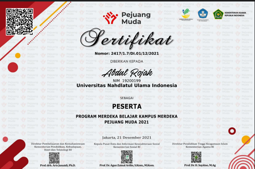 Mahasiswa kebanggan Fakultas Hukum Universitas Nahdlatul Ulama Indonesia Jakarta, Abdul Rozak Program Studi Ilmu Hukum, berhasil menjadi Peserta Program Merdeka Belajar Kampus Merdeka Pejuang Muda 2021. Dalam Penghargaan ini Abdul Rozak menunjukkan semangat juang dan belajar. Penghargaan ini tidak hanya mengharumkan nama Universitas Nahdlatul Ulama Indonesia Jakarta , tetapi juga menjadi bukti hasil kerja keras dan disiplin Abdul Rozak yang didukung oleh teman teman dan keluarganya.