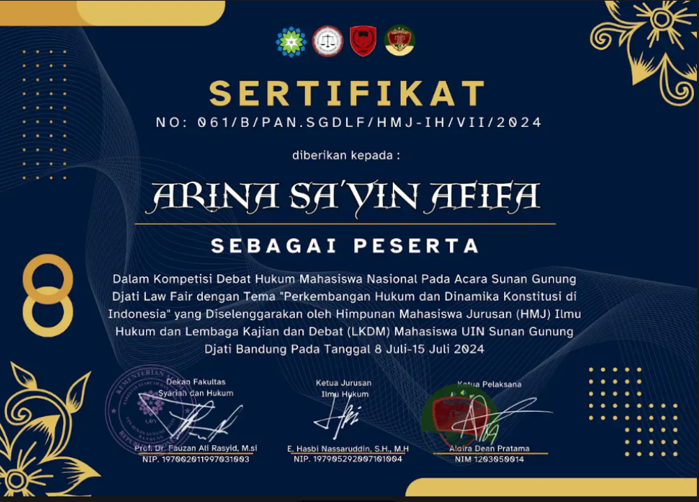 Arina sayin afifa raih penghargaan 8 Besar Debat Hukum Mahasiswi Nasional