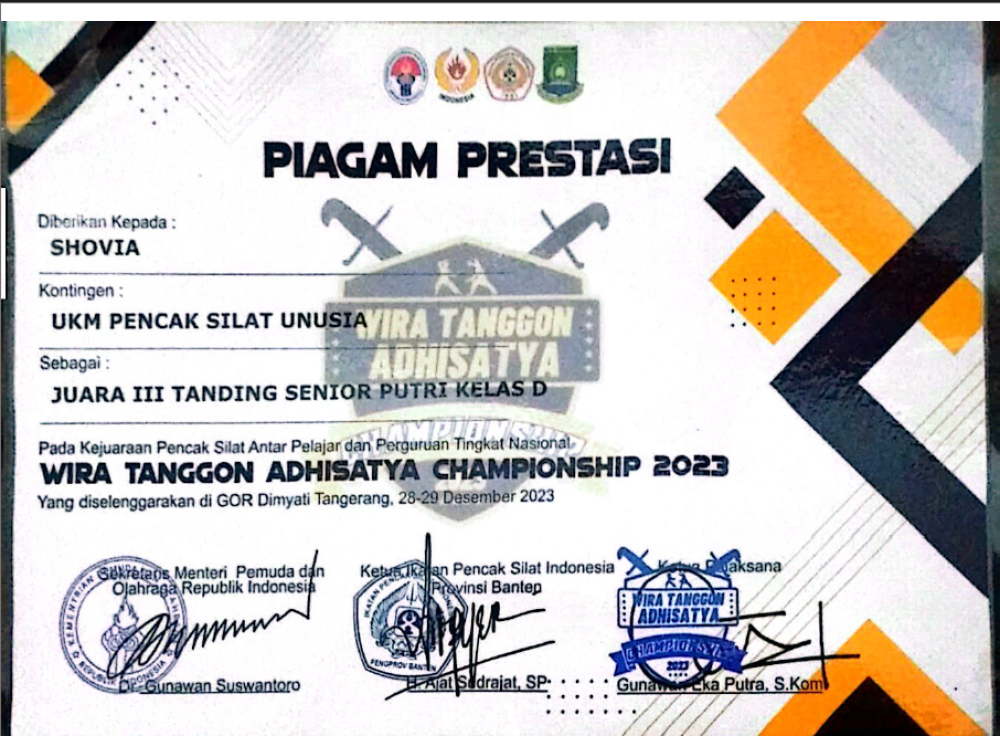 Shovia Raih Piagam Prestasi Juara III Tanding Senior Putri Kelas D UKM Pencak Silat